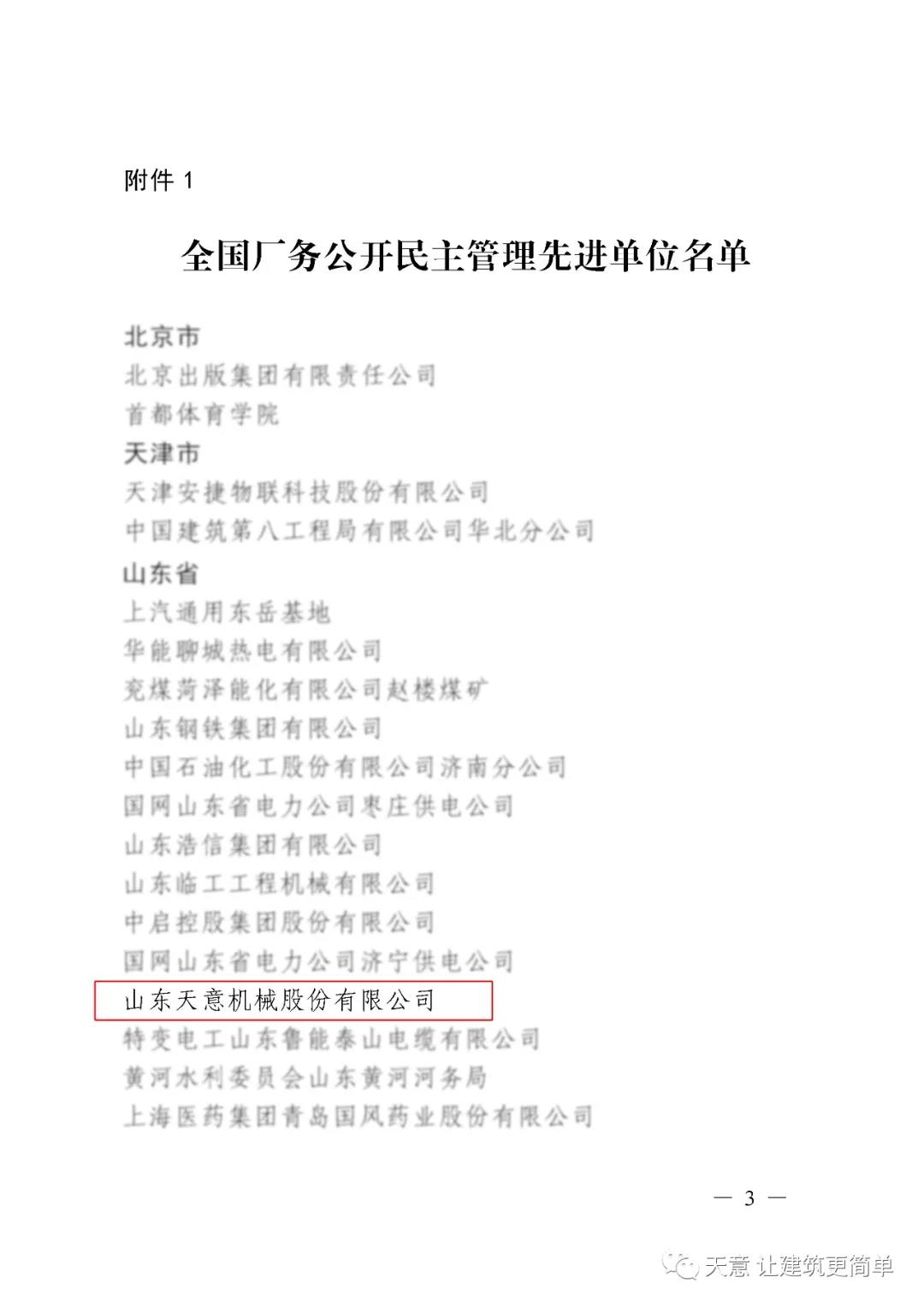 喜訊丨祝賀天意機(jī)械被授予“全國(guó)廠務(wù)公開(kāi)民主管理先進(jìn)單位”稱(chēng)號(hào)